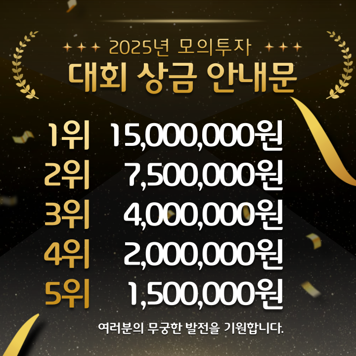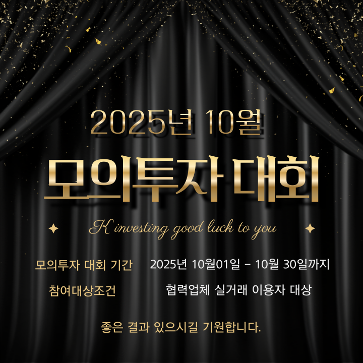 안녕하세요 해선슈어맨입니다. 해선슈어맨에서만 참여하실 수 있는 빅EVENT!! 2025년 10월 모의투자 대회를 개최합니다! 안녕하세요 해선슈어맨입니다. 9월달이 지나가고 가을을 알리는 10월이 다가오고 있습니다. 무더위가 지나가고 날씨가 많이 시원해졌네요 항상 건강 챙기시고 다가오는 10월에도 행복한 일만 가득하길 기원하겠습니다. 항상 저희 해선슈어맨을 찾아주신 많은분들께 항상 감사한 마음 전달 드립니다. 자세한 내용 아래 남겨드리겠습니다. 항상 감사합니다. 언제나 최선을 다하는 해선슈어맨이 되겠습니다. [기간안내] 대회기간 : 2025년 10월 01일 - 10월 30일까지 사건참가 신청기간 : 2025년 09월 24일 - 10월 03일 오후4시까지 최종순위 발표일 : 2025년 11월01일 오후4시