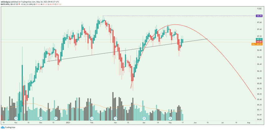 HYG 라는 하이일드 ETF임, 쉽게 말해 좀 부실한 회사들이 발행하는 회사채에 투자하는 ETF 라고 보면 된다.