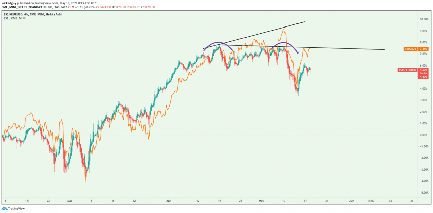 보다시피, 에센피가 신고가를 높이는 시점에 유로 달러로 나눈 값은 지지 부진하면서 고점을 높이지 못하고있지?
