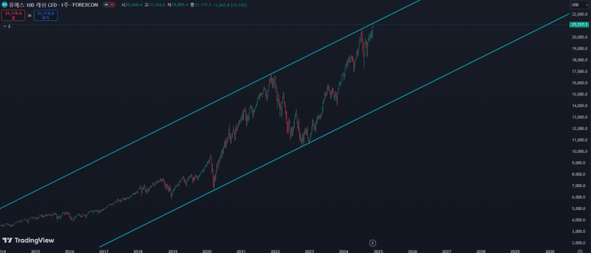| 나스닥 주봉단위 채널만 그어봐 애두라 초고점같은디 |