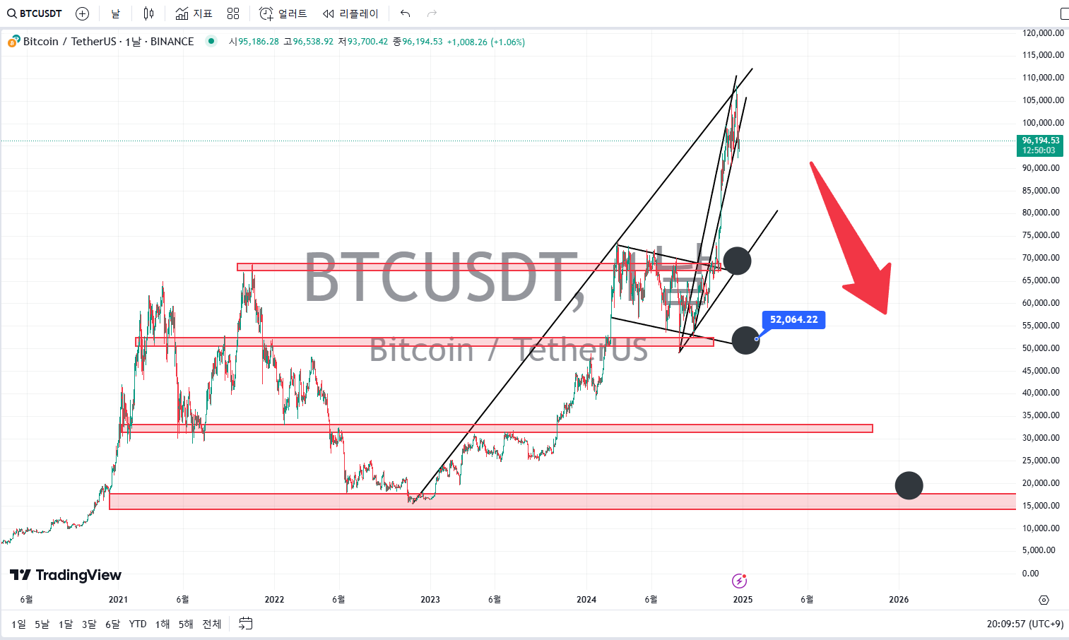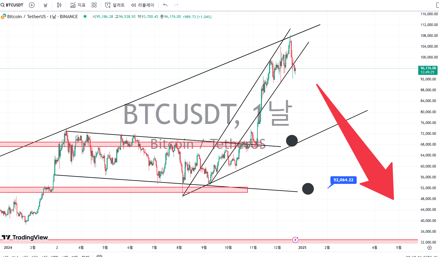 | 비트코인 조ㄴ나게 중요한 자리네 추세 머리꺽이는듯 잘봐 형들 차트분석이야 |