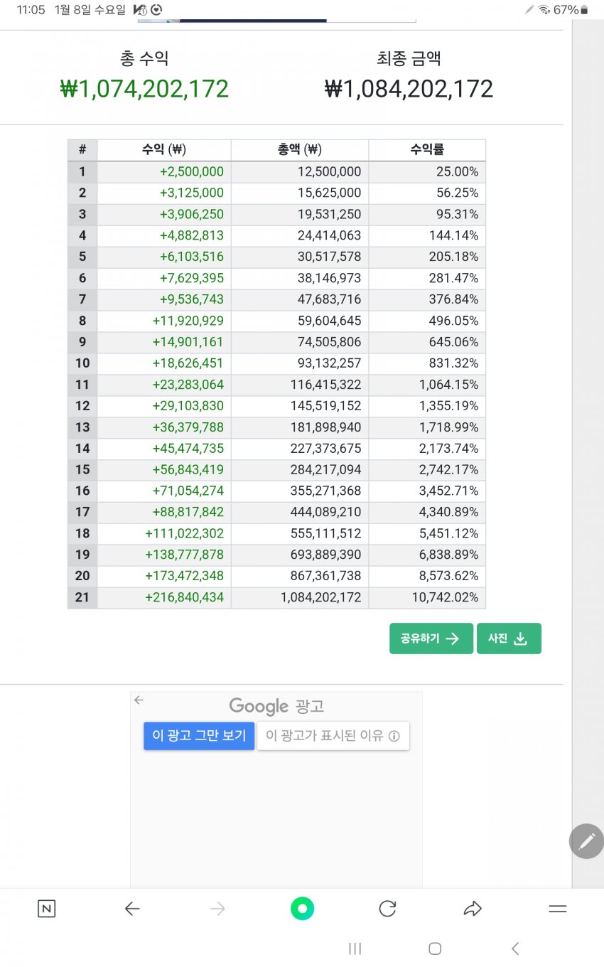 난 매매 겁나 못하니까 한달에 25%짜리 수익 5회 X 4개월이면 100배 언저리