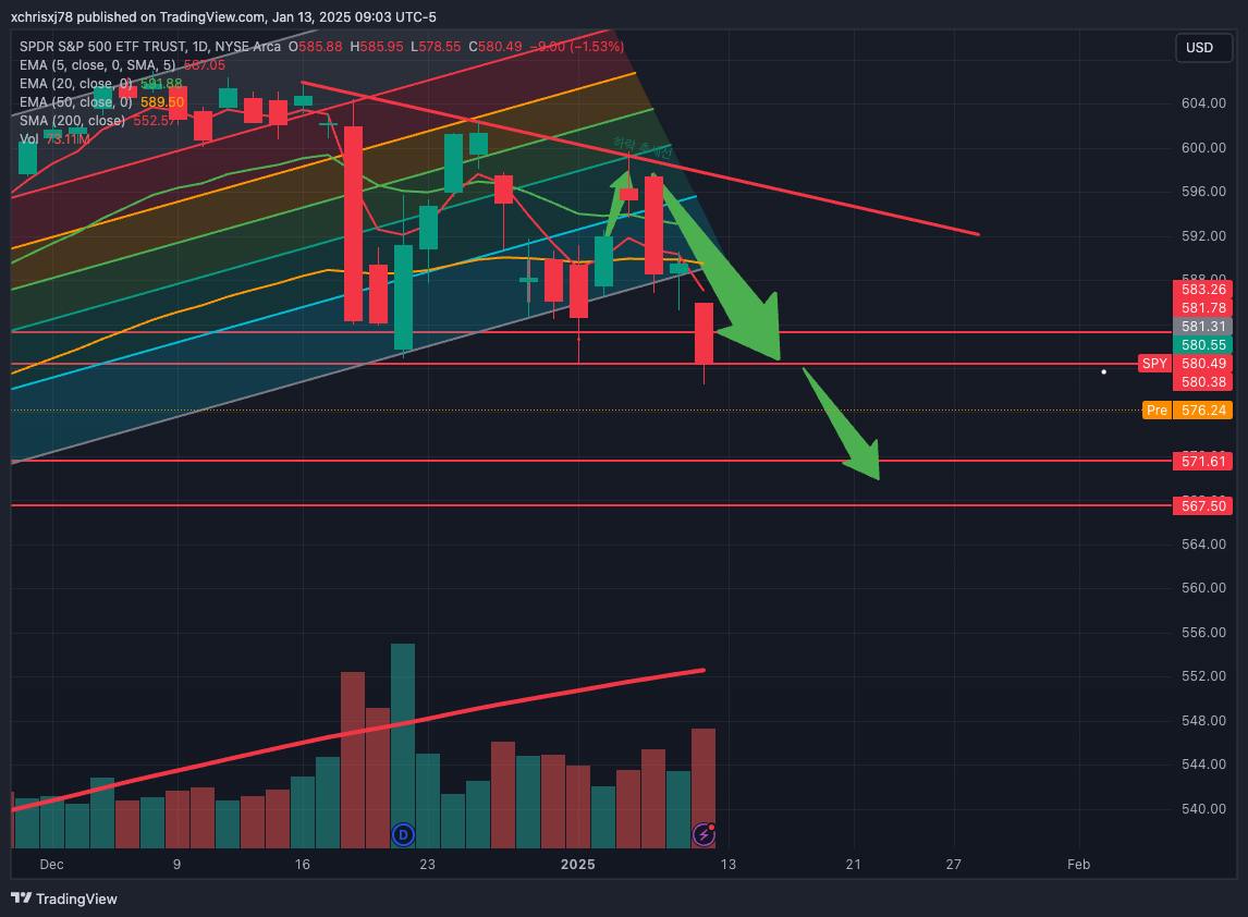 SPY가 다음 지지를 받을 저가 매수 구간은 571~567로 S&P500으로는 5710 레벨 수준.