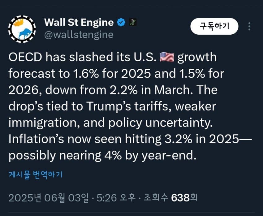 [GPT] OECD, 美 성장률 전망 대폭 하향…물가도 상향 [핵심요약] (1) OECD, 미국 2025년 성장률 2.2%→1.6%로 하향 (2) 2026년 전망도 1.5%로 낮춰 (3) 하향 원인: 관세, 이민 감소, 정책 불확실성 (4) 2025년 물가상승률 3.2%, 연말엔 4% 근접 가능성 (5) 정책 불확실성 속 경제 둔화·물가 압력 동반 [제미니] (OECD, 미국 성장 전망 하향 조정) [핵심요약] (1) OECD, 2025년 미국 성장률 전망치 1.6%로 하향 (3월 2.2%에서) (2) 2026년 미국 성장률 1.5% 전망 (3) 하향 원인: 트럼프 관세, 이민 약화, 정책 불확실성 (4) 2025년 물가상승률 3.2% 예상 (5) 2025년 말 물가상승률 4% 근접 가능성 |