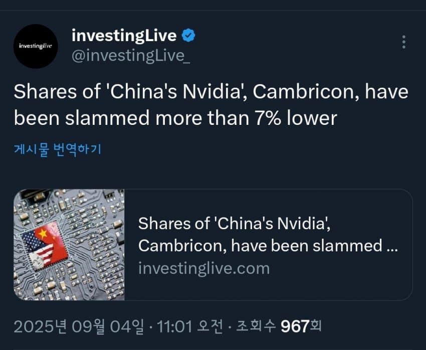 중국 '엔비디아' 캄브리콘 주가 7% 급락 [핵심요약] (1) 중국 반도체 기업 캄브리콘 주가 7% 이상 하락 (2) ‘중국의 엔비디아’로 불리며 시장 주목받던 기업 (3) 주가 급락으로 투자자 이목 집중 [한줄 요약] 중국의 ‘엔비디아’로 불리는 캄브리콘 주가가 7% 넘게 급락했다 [제미니] '중국의 엔비디아' 캠브리콘 주가 7% 이상 급락 핵심요약: '중국의 엔비디아'로 불리는 캠브리콘의 주가가 7% 넘게 하락했다. |